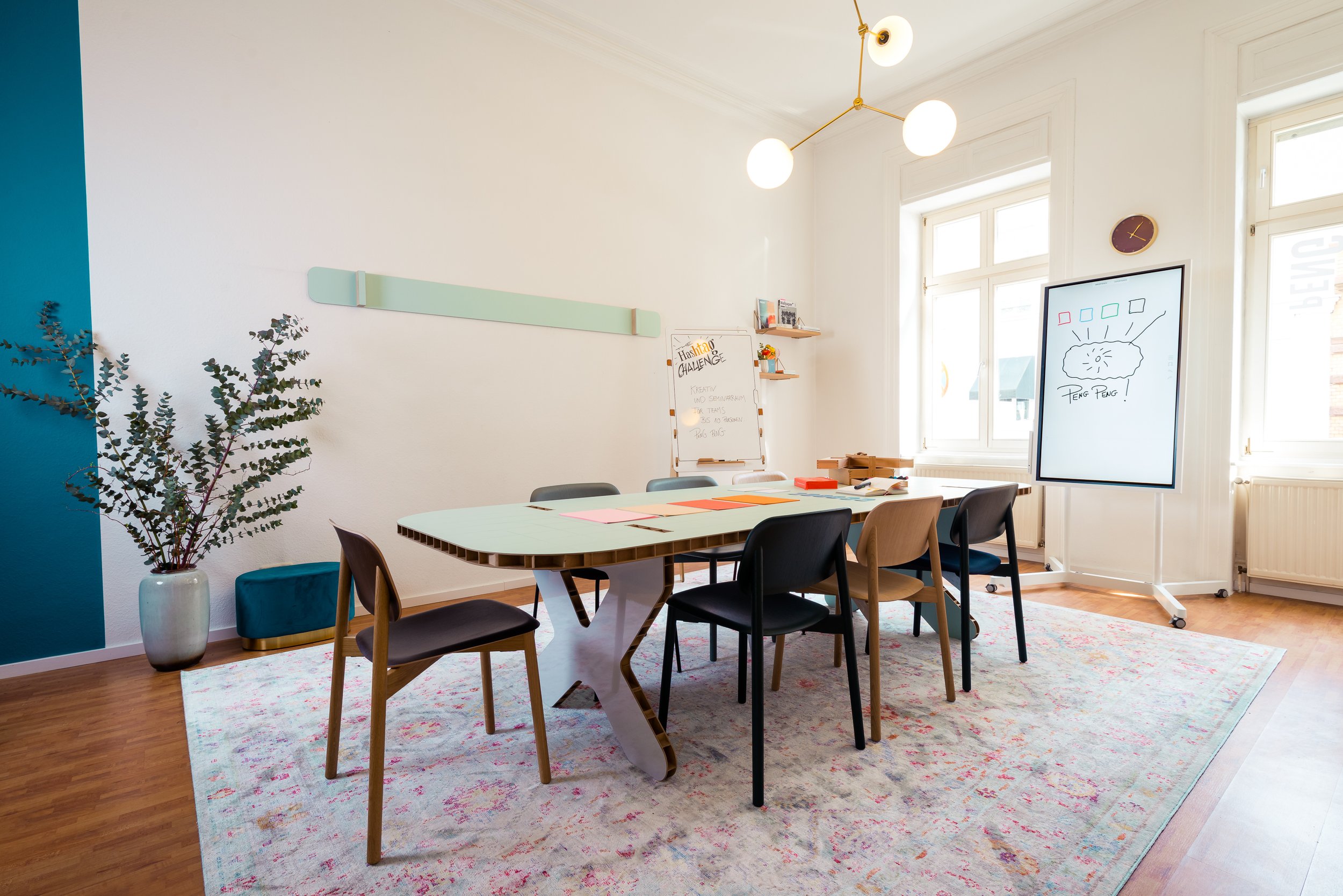 Mit einer Grundausstattung von Stühlen, Tischen, digitalen und analogen Whiteboards (wie Samsung Flip), diversen Stiften, Papier und Flip Charts bietet unser Raum die Möglichkeit für Meetings, Workshops und kreative Denkprozesse.